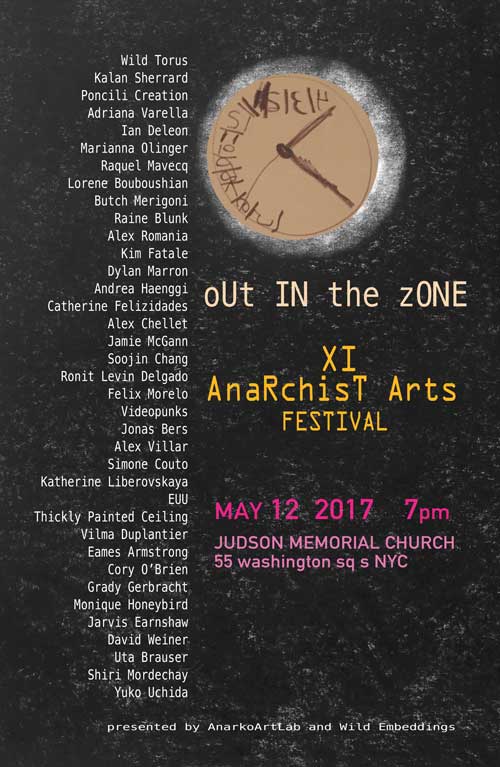 The 11th NYC Anarchist Art Festival will focus on projects inspired by the idea of envisioning a post-revolutionary anarchist society, where art exists not as a celebration of individuality, but as communal process, and a diverse unity of unique personages. Therefore the festival will present an alternative to, and an inversion of media entertainment culture, appropriating its means and tools toward an experimental experience of collective anarchic creation. Anarchy in this context reflects not a desire for a chaotic society, but true horizontal self-organization.