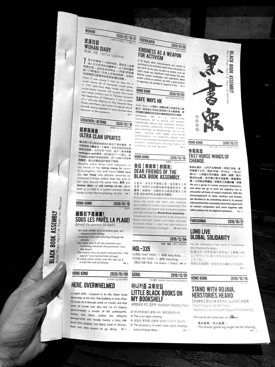 More-Than-Half-A-Year-in-Review Newsletter (2020) The Black Book Assembly was a transnational gathering of activists, publishers, artists, and musicians that took place across various locations in Hong Kong in 2017 and 2019. Unable to organise renewed efforts since then, the question “Why black?” remained as a meta-inquiry to an as-of-yet-unknown life in common, beyond the bounds of race, class, nation state, gender and ability. The More-Than-Half-a-Year-in-Review newsletter, as a printed bridge to this group disparately not yet a group, certainly not an institution, and maybe not even a community, continues updates and dialogues between its various participants, spread from Hong Kong to Fukushima, Yogyakarta and Wuhan. A second edition is currently in production, to be released by South Korea’s Anarchy Group. | www.blackbook.hk Printed Edition of 300 copies, digital copies freely shared online.