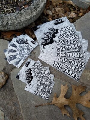 “Always Against the Tanks.” Small vinyl sticker for $0.20 each, or $3.00 for a set.