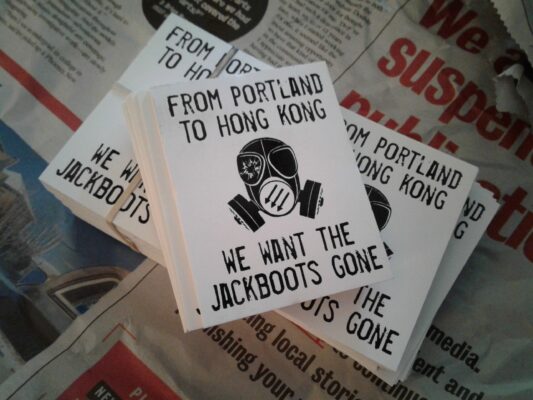 “From Portland to Hong Kong, We Want the Jackboots Gone.” Small vinyl sticker for $0.20 each, or $3.00 for a set.