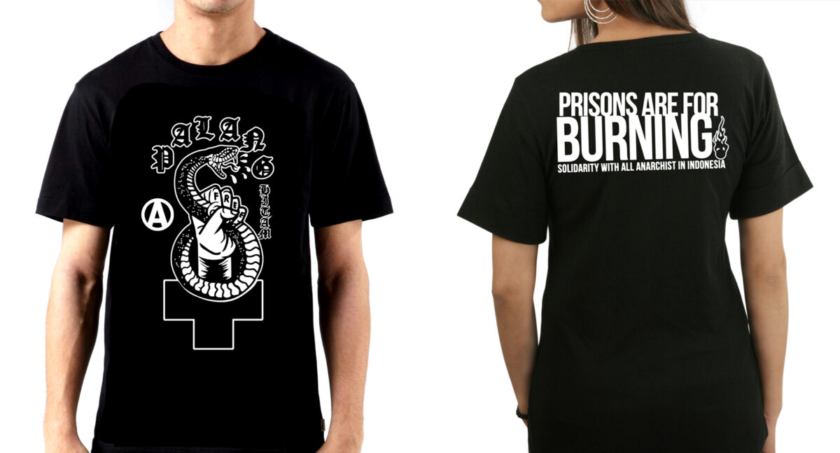NYC ABC printed these shirts in solidarity with anarchists in Indonesia, facing continued, intense state repression. Prisons are for BURNING! Make sure to include the size you want in the notes of your sale as well as your mailing address. Shipping within the continental United States is included in the price of this shirt (include size and your address in the notes for the sale).