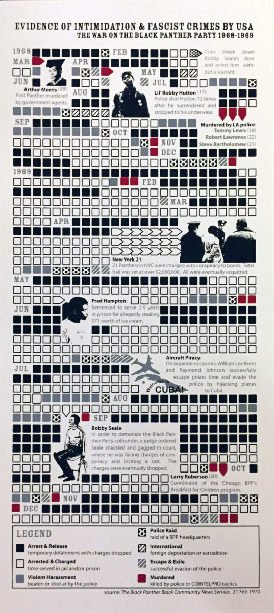 This poster is a marvel in screen-printing on paper—intricate, precise, and outstanding. This poster is a graphic reproduction from the book “Edible Secrets” by Mia Partlow and Michael Hoerger, measures 9 1/2″ by 21″ and is shipped in a poster tube. The history of state repression against the Black Panther Party in this infographic will have you revisiting it over and over. Shipping within the continental United States is included in the price of this poster (include your address in the notes for the sale).