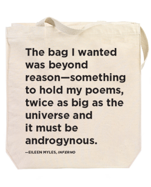 This elegant, hard-wearing tote features a quote from Inferno (a poet’s novel), our bestselling book by Eileen Myles, who John Waters described as having a “gruffly beautiful, sure voice of reason.” Printed black on natural, 100% recycled cotton. Reverse side sports the OR logo. Measurements: 13″w x 14″h x 3″d